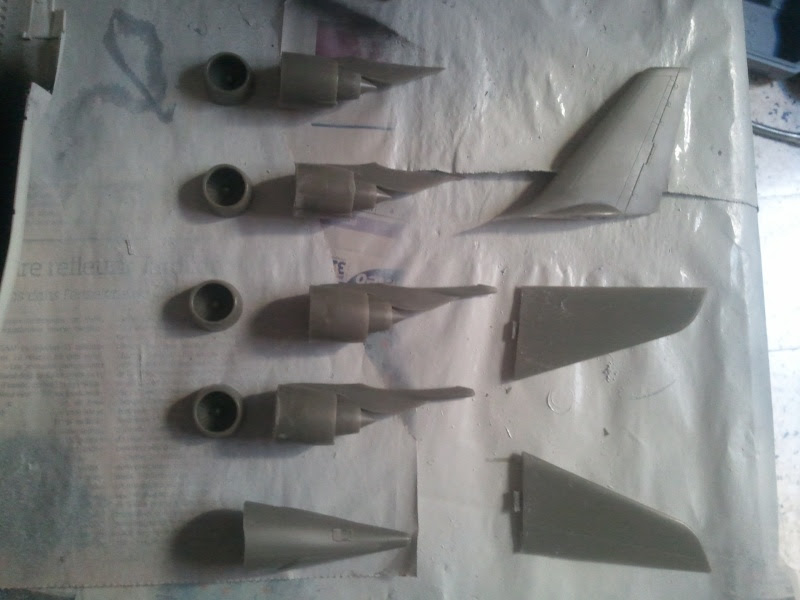 Les réacteurs ont été assemblés mais une grosse séance de mastico-ponçage s'est imposée..... Les trains principaux latéraux ont également été assemblés. Il en est de même pour le train avant qui dont la case sera collée sur la pointe avant.