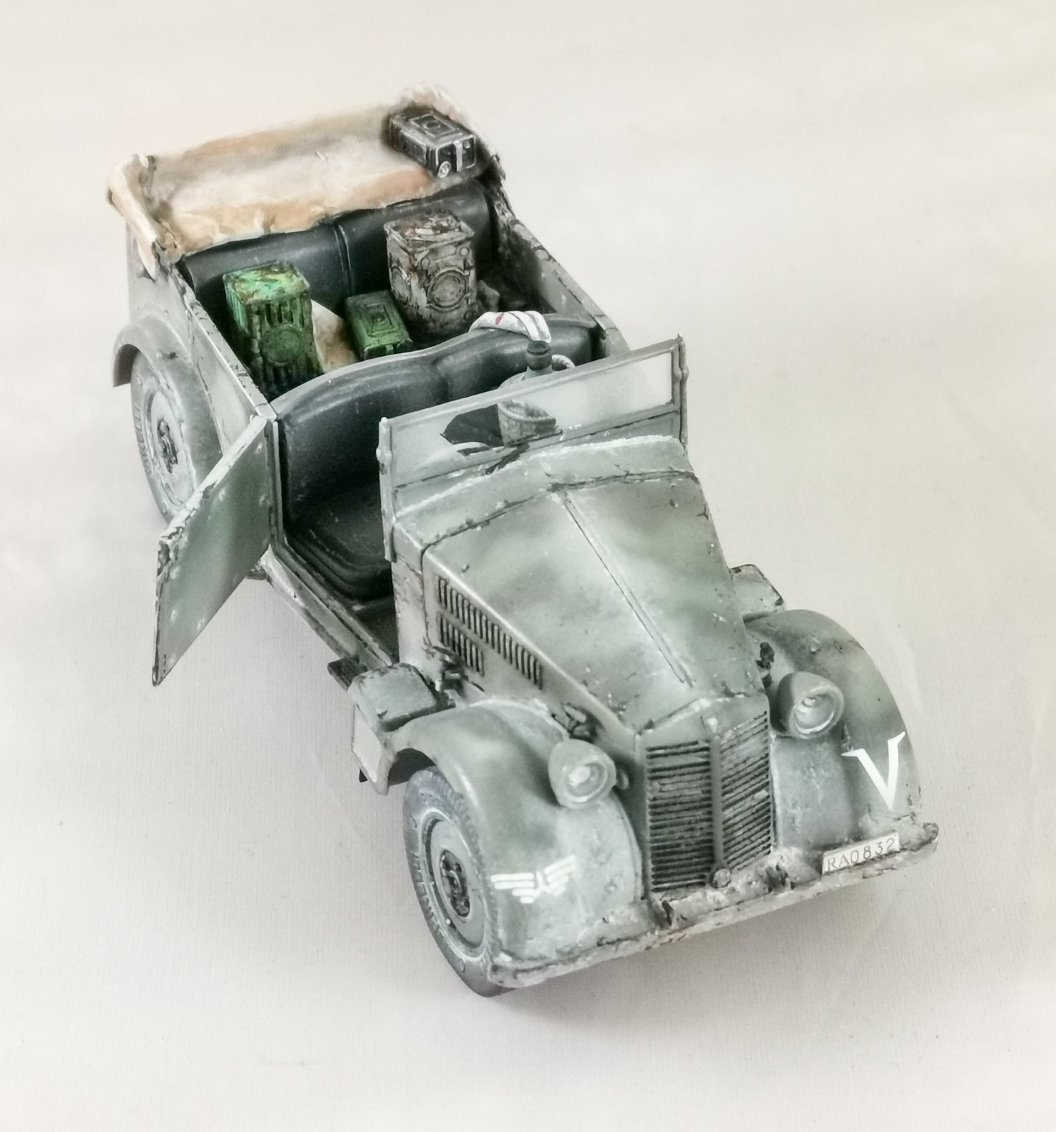 Le kit s'assemble bien, sans difficulté particulière. Le niveau de détail est tout à fait correct, même si 2 parties méritent un remplacement: les roues et la capote. Les roues sont imprimées en 3D, à partir d'un fichier acheté sur internet. La capote est un scratch à base de profilés plastique et de green stuff.